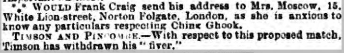 And yet if Craig – who was known as the Harlem Coffee Cooler – had moved to England in 1894 and Moscow had disappeared in 1892, what on earth has this particular Frank Craig got to do with anything? How could they have known each other? Sure, this is perhaps extremely tangential, but Craig was from New York. He made his debut there as a boxer in 1891 and over the next couple of years fought largely in New York and occasionally Boston and Philadelphia.