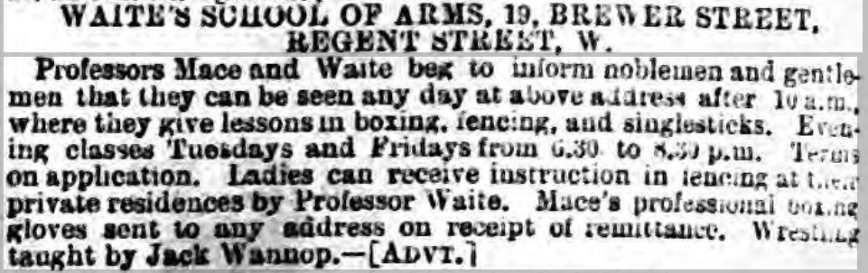 Now settled back into his role as “the most popular man in New Cross”, Wannop wound up the night boxing Alf Mitchell. Two days later he was at Waite’s School of Arms on Brewer Street in Soho, “amusing the company” with three rounds of Catch-wrestling against a Kit Elwood, winning the match with a cross-buttocker. Ever the hard worker, he wound up the night with a boxing match against Jem Mace Jnr.