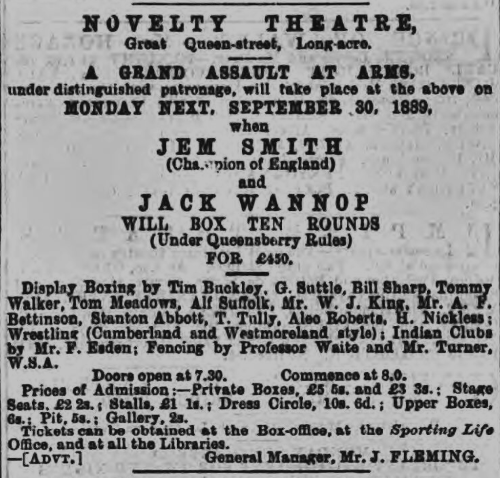 This short interview with Jack Wannop is reproduced here as it appeared in The Sporting Life on Saturday 28 September 1889. My only edits are the paragraphing and photographs. It was published after this wonderful interview with his opponent Jem Smith, under the headline A Chat with the Champions. We learn very little, but it is still an enjoyable read.