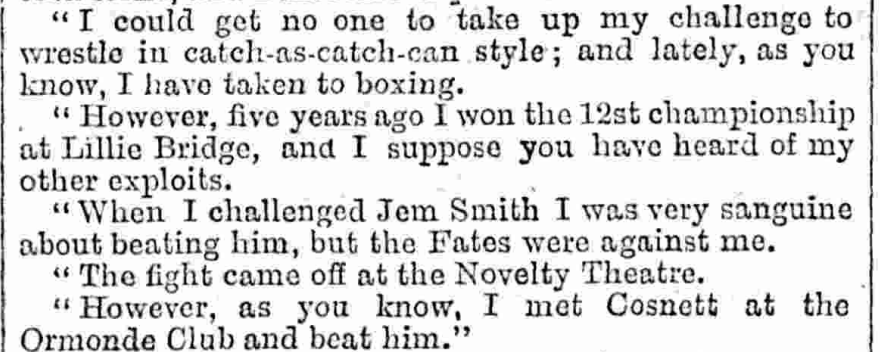 In answer to some questions of a biographical nature, Jack told them his birthplace (Carlisle) and coyly noted that he was “over thirty years of age” (he would have been 36 in 1891), tipped the scale between thirteen and fourteen stone when in training, and had a chest measurement of 42 1/2 inches. He then zoomed quickly through some career highlights: