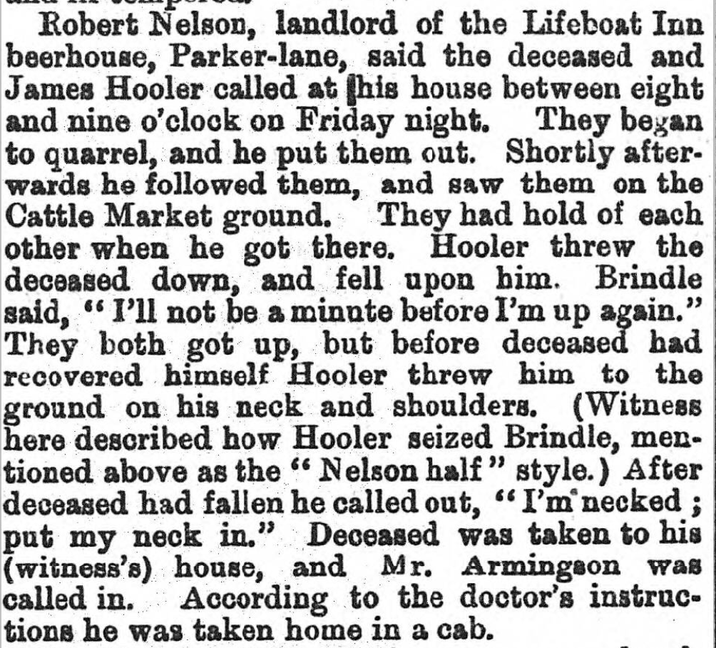 In 1878 a young man called Hooler was put on trial in Liverpool for the crime of accidentally killing a man named Brindle as a result of a half-Nelson. The unfortunate incident occurred at Burnley cattle market on the 9th November 1877.