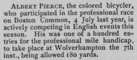 Through McKay’s research we can place Albert, then still in his late teens, in Chicago in 1879 and 1880, race-walking. He was bike racing in Williamsburg, Long Island in August 1880 and we find him resident in New York during the summer of 1881, and cycling in Boston.