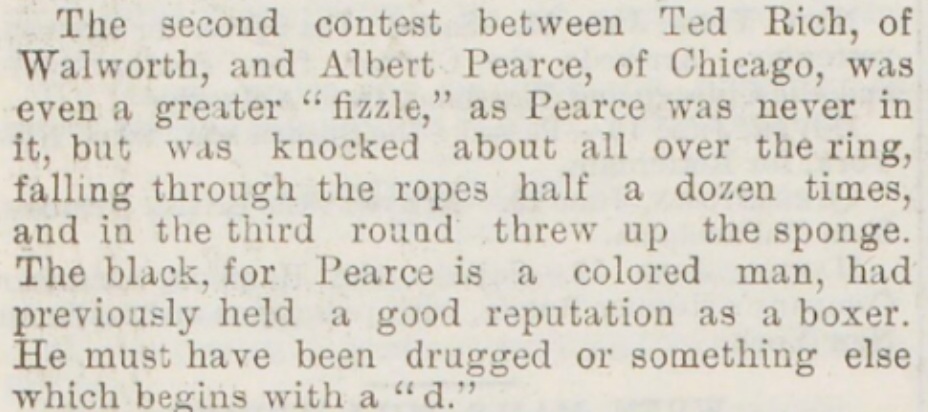 It had been difficult to find much out about his involvement with the sport. The UK sources available to me – I rely heavily on the British Newspaper Archive at the moment – did not provide much information. The discrepancy in Pearce’s name (he is sometimes referred to in sporting newspapers as Pierce) didn’t help, either. Despite being an American, who grew up in Chicago or close to it, American newspapers available to British researchers through the Library of Congress archive did not provide much information.