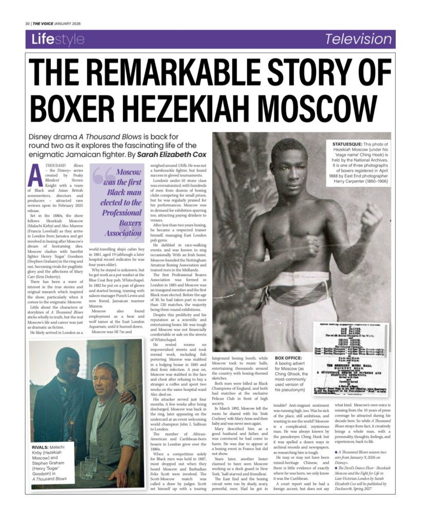 The Voice, Britain’s Black newspaper, published my full page article ‘The Remarkable Story of Boxer Hezekiah Moscow’ ahead of the season two A Thousand Blows launch in January 2026. Huge thanks to the newspaper and especially Lifestyle Editor Joel Campbell for appreciating true histories!